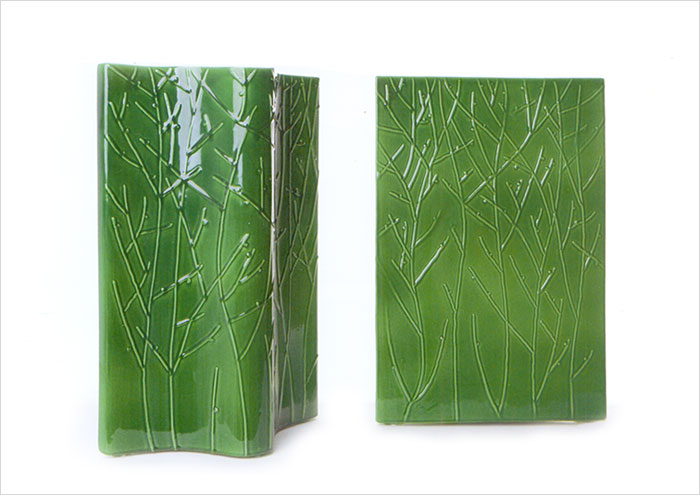 La collezione “Roseti” è costituita da tracce vegetali di erbe e rami che lasciano la loro impronta sulla ceramica verde, come un ricordo di prati e cespugli.