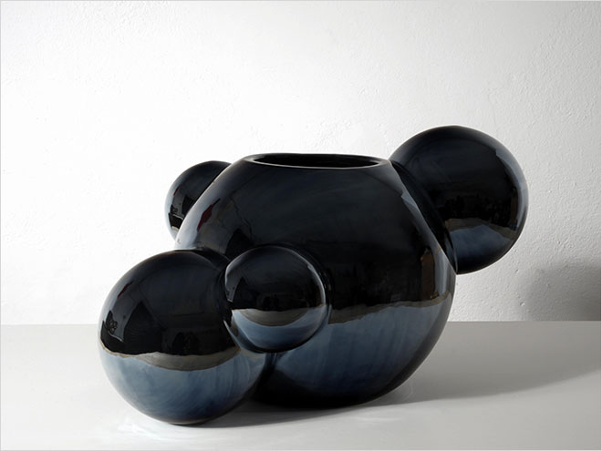 This vase consists of various spheres, with varying diameters, penetrating into each other to generate a complex figure. Visually, the work refers to soap bubbles, when they remain attached to each other for a brief moment. But here, what is evident, is the weight, the ceramic material.